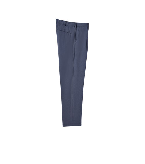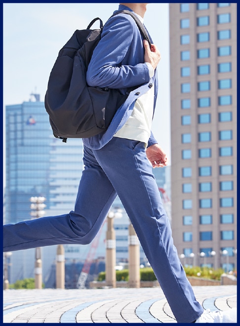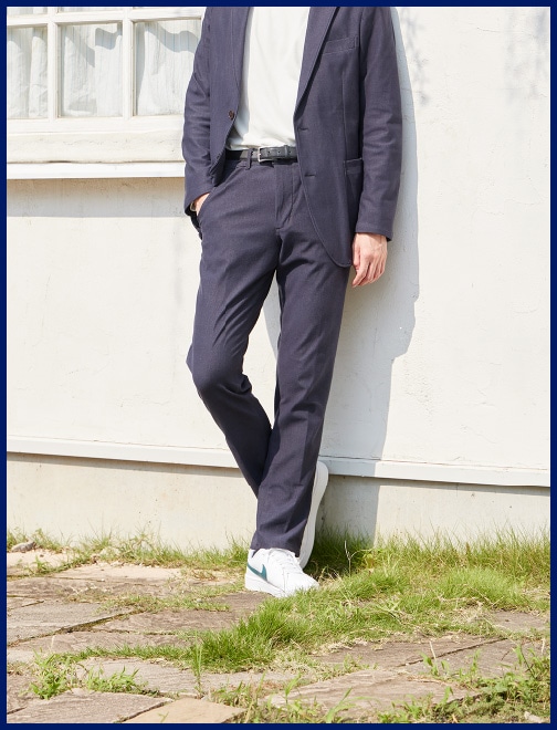 ビジネスシーンで穿くことが多いんですが、ストレスを感じることがないのがいちばん嬉しいですね。伸びやすい素材なので、しゃがんだりするときも無理がなくて。休日もリラックスして穿けるのがいいです。